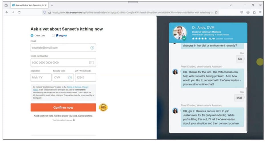 In several enrollment flows cited in the FTC’s complaint, consumers interacted with a website chatbot that told consumers it would send them a registration form where they could join the service for $5. The chat was then displayed simultaneously with the registration page.
